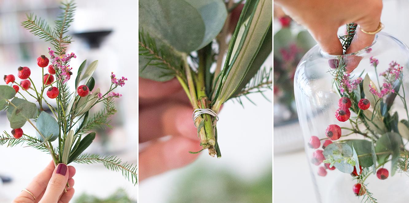 1.) Schneidet etwa 12 cm lange Stücke der Hagebutte und der Wachsflower-Sträucher zurecht. Die Tannen-, Eukalyptus- und Olivenzweige dürfen ruhig etwas länger darüber hinausstehen. Bindet nun mit dem Draht kleine Sträußchen und kappt die Enden. Aufgepasst: Die Gestecke dürfen auf keinen Fall zu breit sein, sonst passen sie nicht mehr in die kleine Glasöffnung.