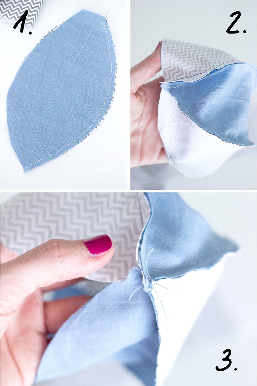 1. Zwei unterschiedliche Stoffteile rechts auf rechts zusammenlegen und auf einer Seite zunähen, von der Spitze bis zum Ende der Rundung, so dass die gerade untere Öffnung unberührt bleibt. Hier wird später die Watte eingesteckt.