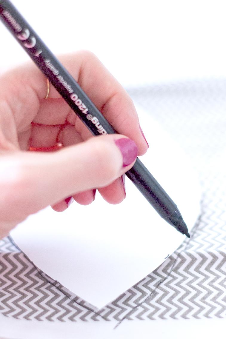 Gewünschte Schablonengröße ausdrucken, ausschneiden und auf jedem Stoff zwei mal die Schablone abpausen. Dann die vier Stoffteile ausschneiden.