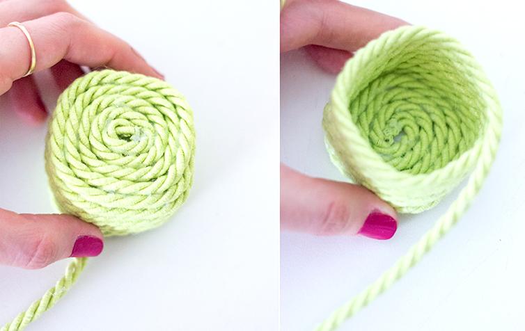 Die Kordel Stück für Stück aufrollen und mit dem Heißkleber in Schneckenhausform verkleben. Zuerst die Unterseite des Körbchens aufrollen und dann Reihe für Reihe die Kordel in die Höhe aufkleben. Das Ergebnis sieht dann von oben und unten so aus: