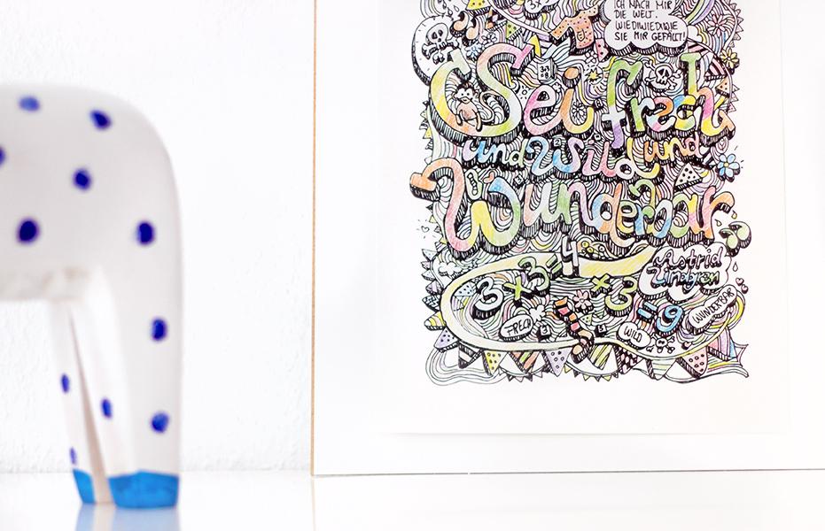 Hier im Hintergrund seht ihr Pippis Klassiker-Zitat, das ja vermutlich in kaum einem Kinderzimmer fehlt: „Sei frech und wild und wunderbar“. Das habe ich vor etwa einem Jahr mal illustriert und jetzt hat es sein Plätzchen gefunden: