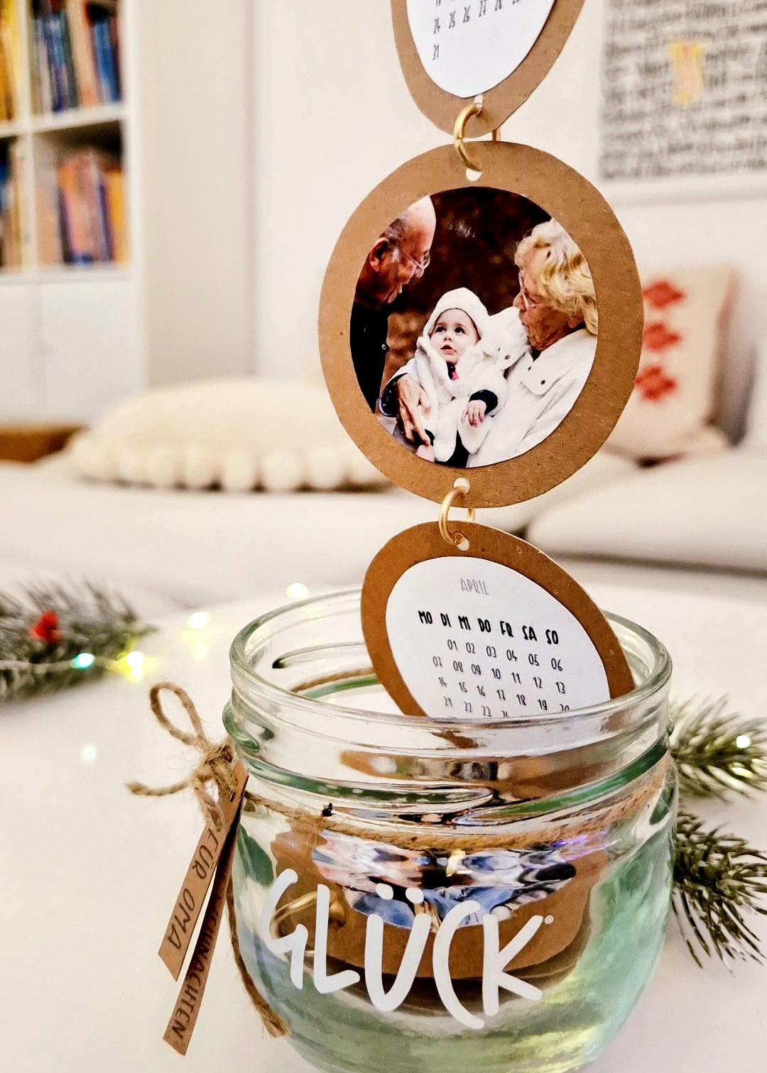 Hier zeige ich euch zusammen mit GLÜCK eine super süße Geschenkidee für eure Liebsten ; zu Weihnachten oder zum Jahreswechsel oder einfach nur so. Wenn ihr den Deckel des Glases hebt, tanzt eine Fotokalender als Girlande hervor ;) Jeder Monat wechselt sich mit einem Lieblingsfoto ab und der Beschenkte kann dieses DIY entweder als Tischkalender verwenden oder aber als Girlande aufhängen. Damit dieses süße und persönliche Geschenk ganz einfach nachzubasteln ist, habe ich die Druckvorlage für euch in der Materialliste verlinkt.
