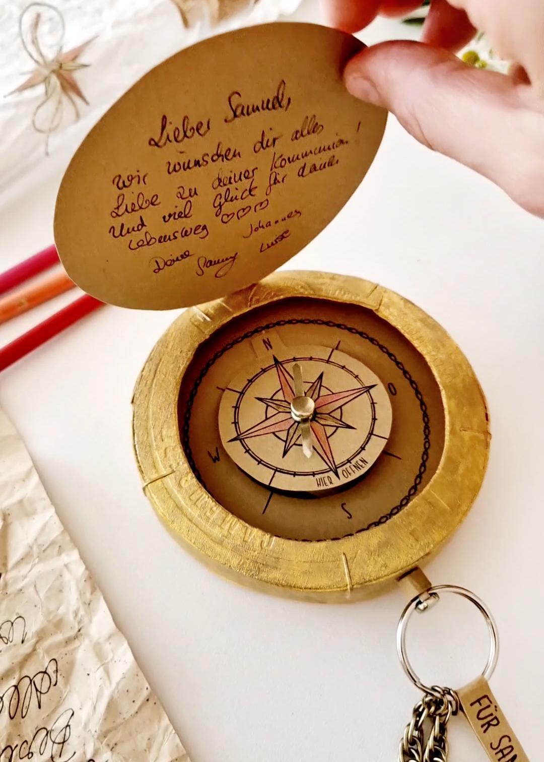 Hier seht ihr eine Idee, die ich mir zur Kommunion & Co überlegt habe: ein Kompass aus einer einfachen Käseschachtel, der einen Wegweiser für den weiteren Lebensweg symbolisiert. Auf dem Deckel steht ein passender Bibelvers. Dann Innere des Kompasses lässt sich öffnen wie ein kleines Geheimfach – darin könnt ihr das Geld verstecken. Der Kompass kann also als Geldgeschenk zur Kommunion, Konfirmation, Firmung oder auch für die Jugendweihe verwendet werden. Dafür habe ich dann einen weltlichen Deckel-Text in der Datei. Die fertige Druckdatei mit allen integrierten Varianten findet ihr wie immer in der Materialliste.