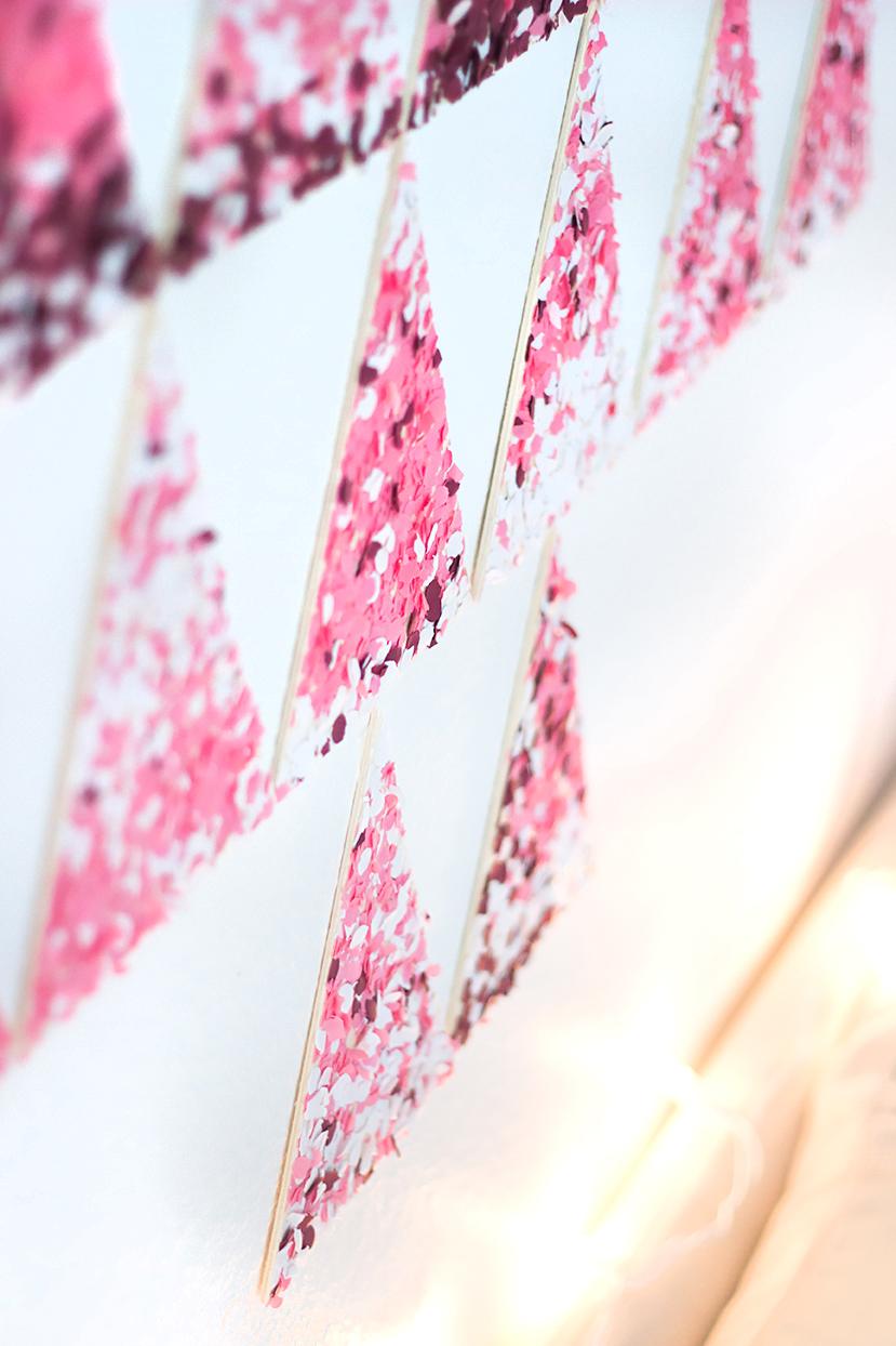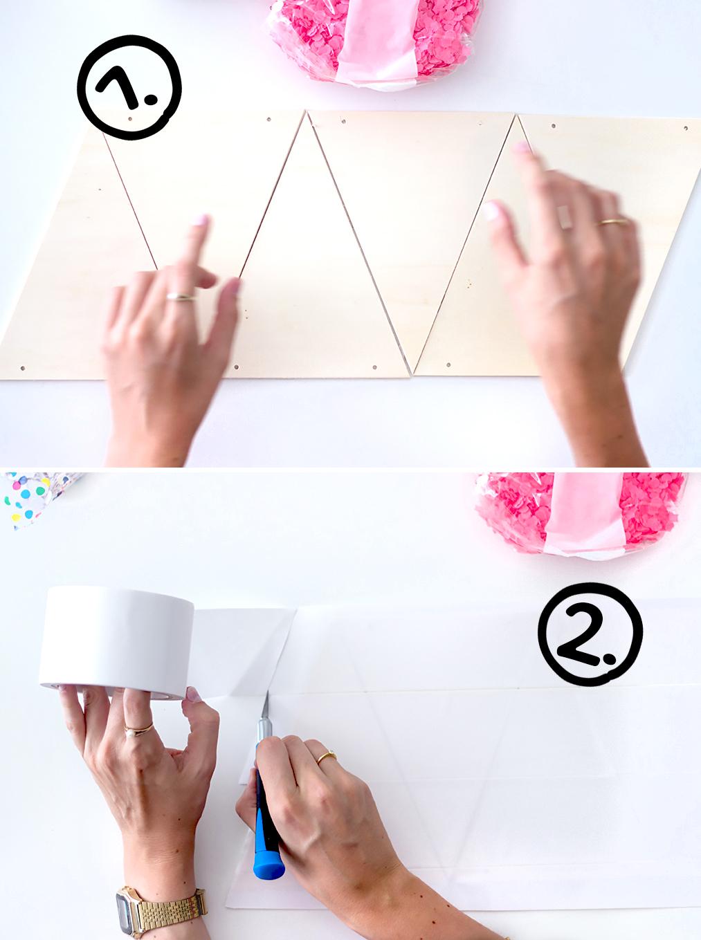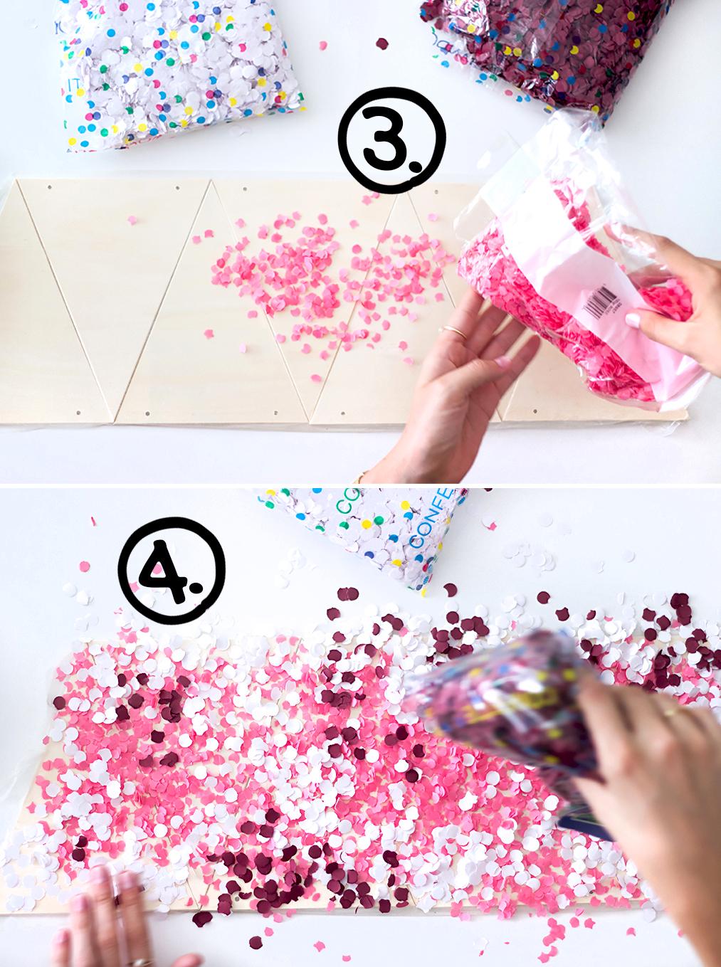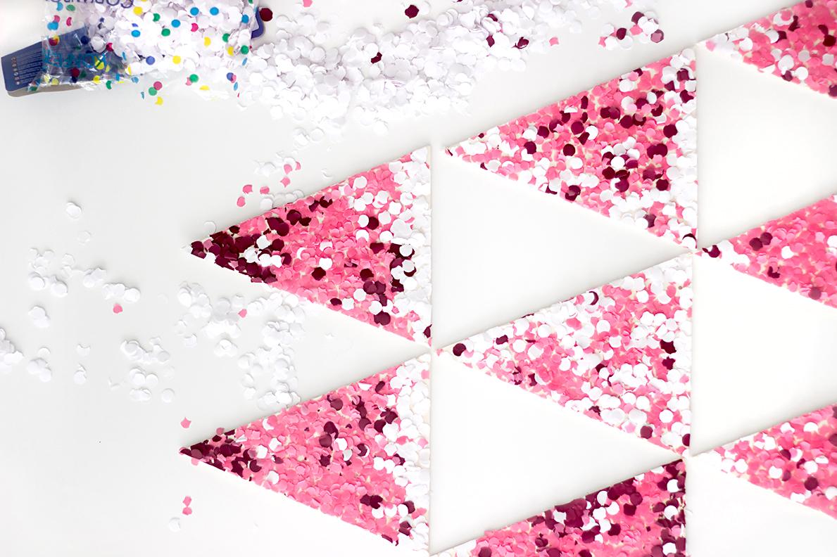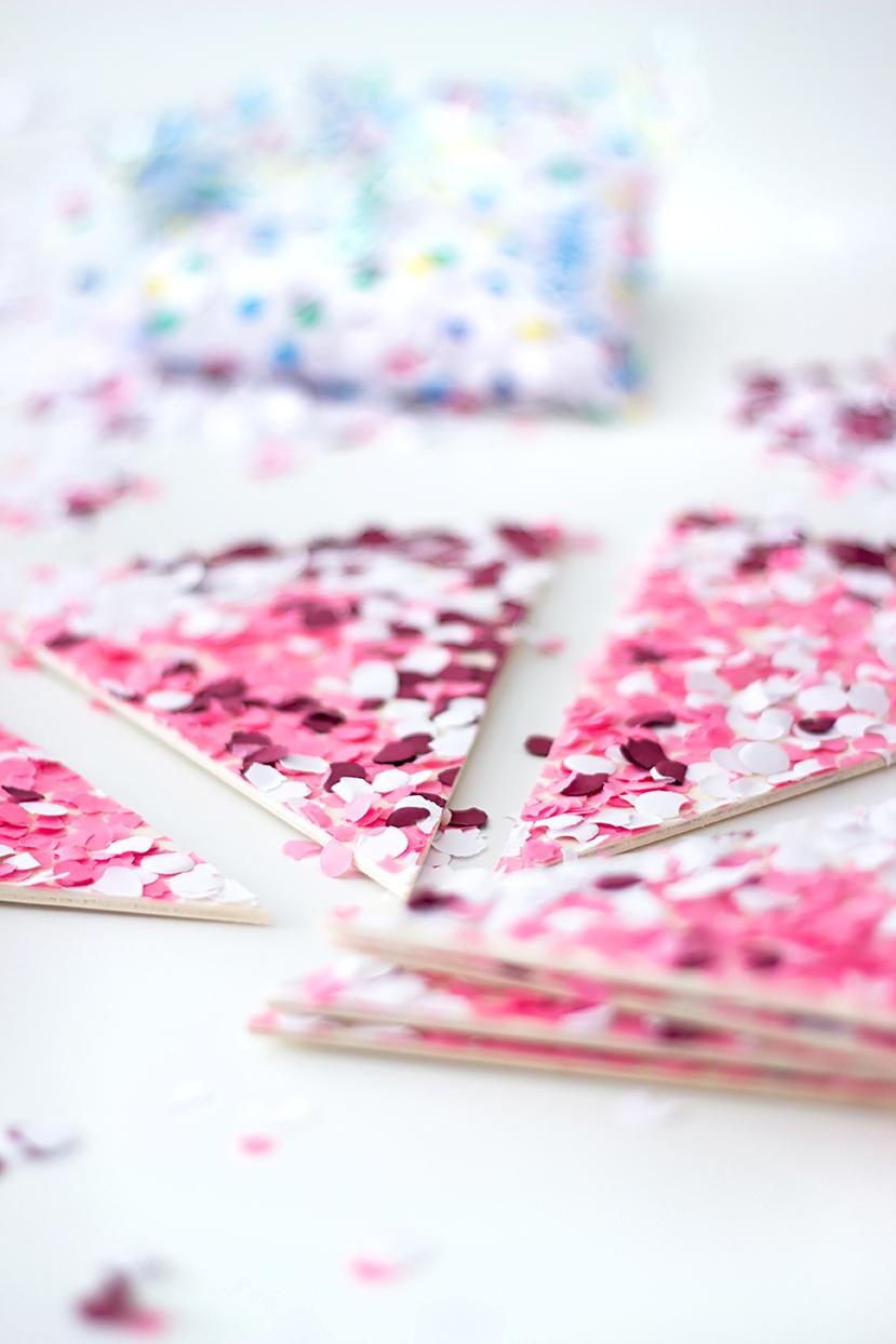 5. Dreht nun die komplette Konfetti-Fläche um und drückt die Holzdreiecke mit den Händen oder einem Buch von der Rückseite her fest an.