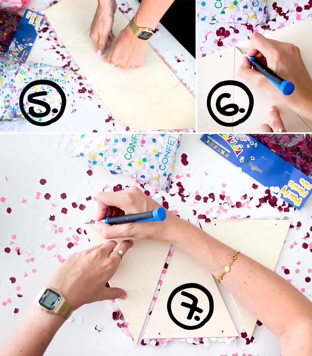 6. Jetzt schneidet die Dreiecke mit dem Bastelmesser auseinander. Übt dabei einen starken Druck aus, damit auch die Konfetti-Schicht gut durchtrennt wird.