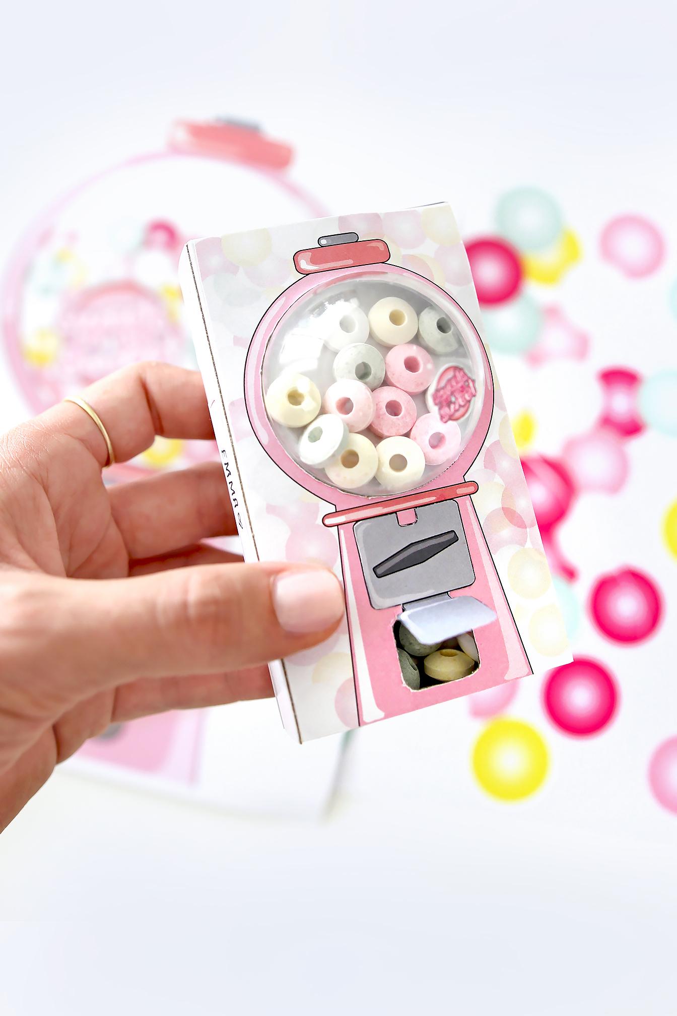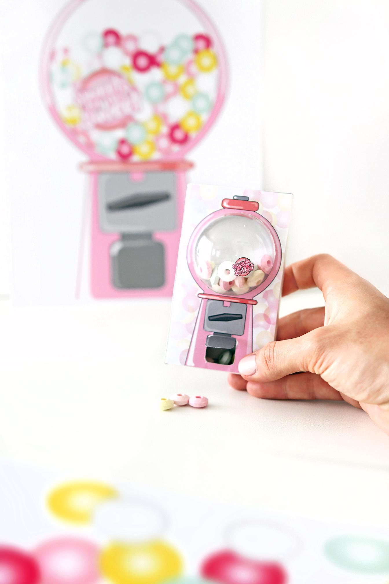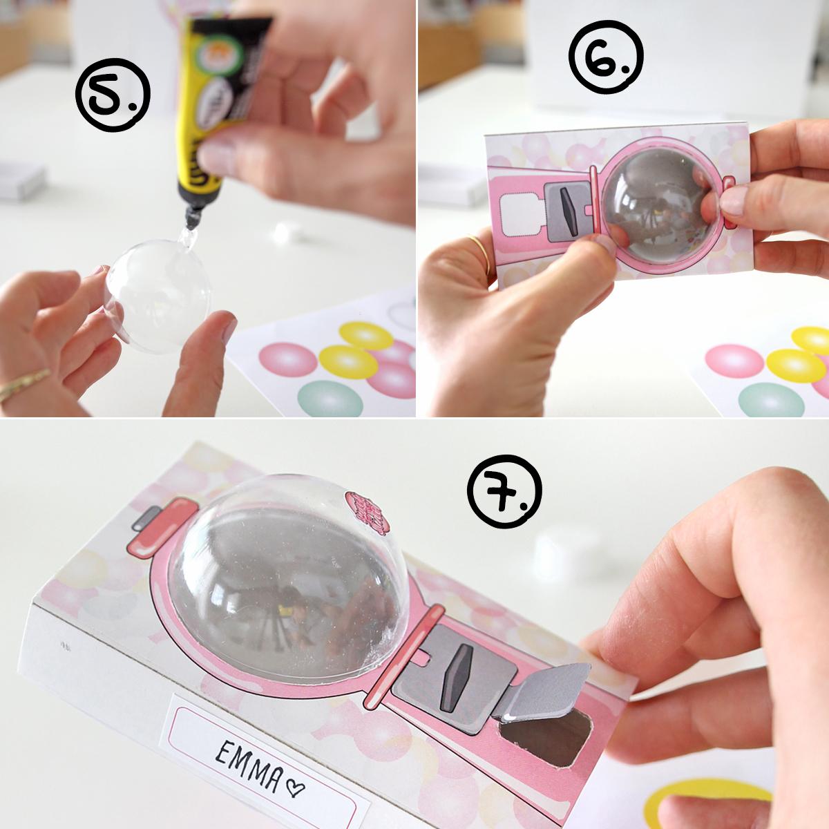 7. Schneidet aus dem A4-Blatt jetzt das silberne Teil aus und knickt den unteren Öffnungsteil nach oben. Klebt den oberen Teil deckungsgleich auf den Kaugummiautomaten. Nun könnt ihr auch die Rückseite ausschneiden und aufkleben und optional ein Namensschild an die Seite. Auch könnt ihr die rosa Seitenteile stattdessen verwenden und einen kleinen „Sweets for my Sweet“-Buttons mit Alleskleber auf die Acrylkugel setzen.