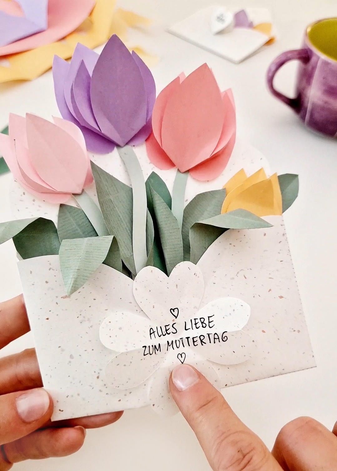 Und ganz neu: Hier habe ich zwei weitere besonders süße Blumen-Ideen für Mama! Einmal die Tulpen mit den versteckten Nachrichten (Zur Anleitung HIER klicken):
