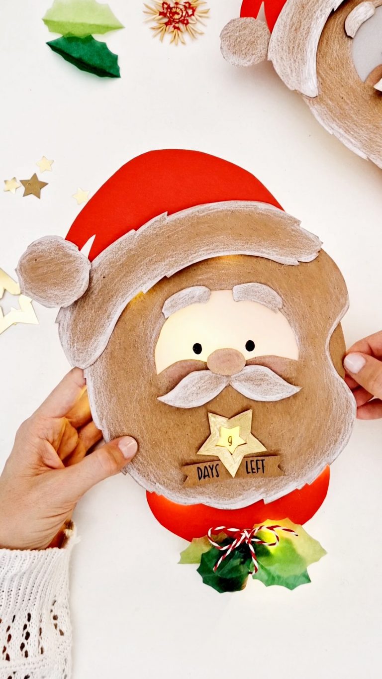 Ich habe hier ne süße Weihnachtsmann Leuchte für euch, mit der ihr die Tage bis Weihnachten rückwärts zählen könnt – einfach an der Drehscheibe drehen und schon läuft der Countdown. Mit meiner Vorlage ist es ganz easy zu basteln. Ihr könnt auf die Rückseite eine Pappschüssel kleben oder diesen weg lassen und einfach eine Mini-Lichterkette mit flachem Schalter am Rand entlang befestigen. Ihr könnt die Weihnachtsmann Leuchte als Willkommensgruß an die Haustüre hängen oder einfach als niedliche Wanddekoration verwenden.