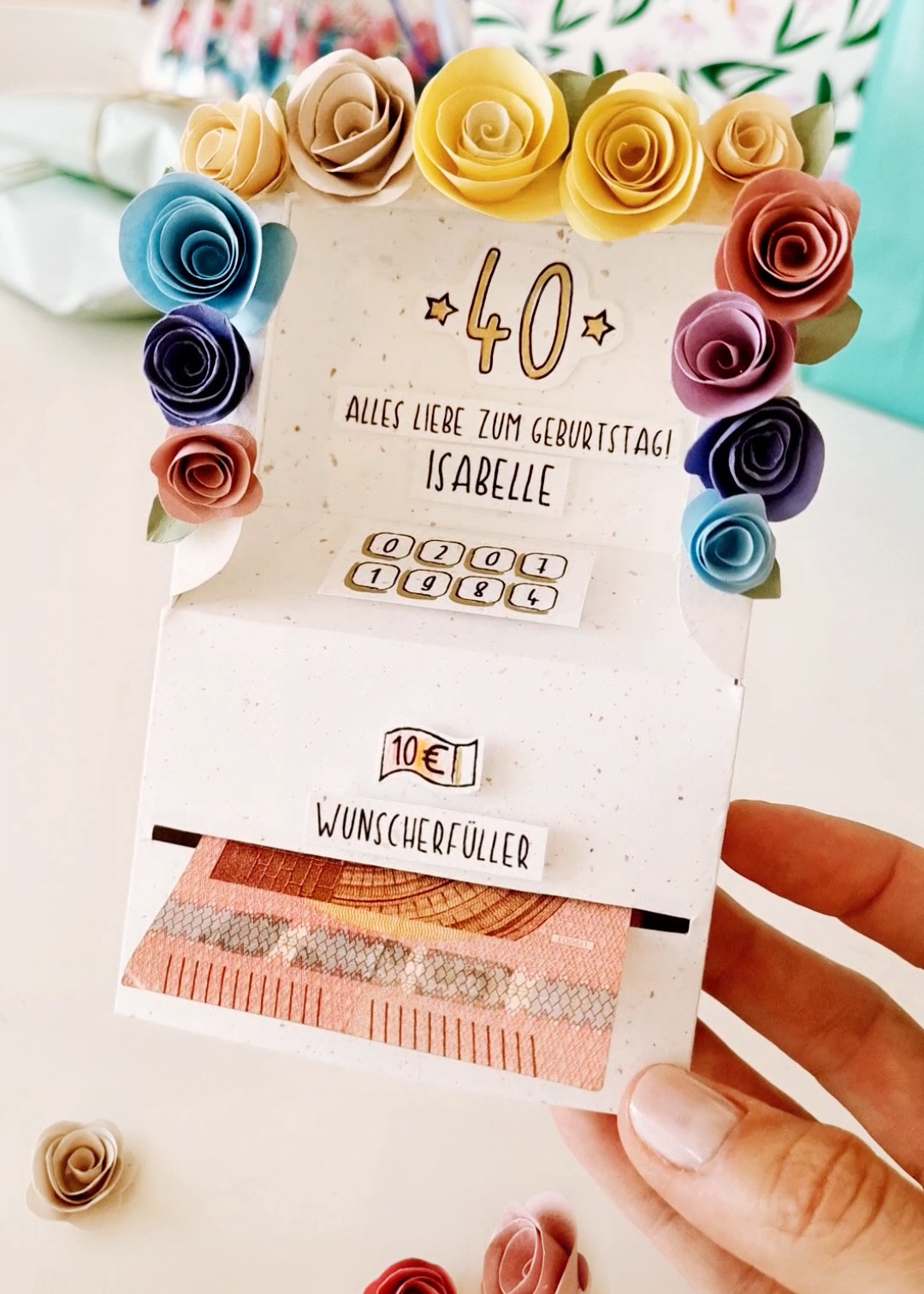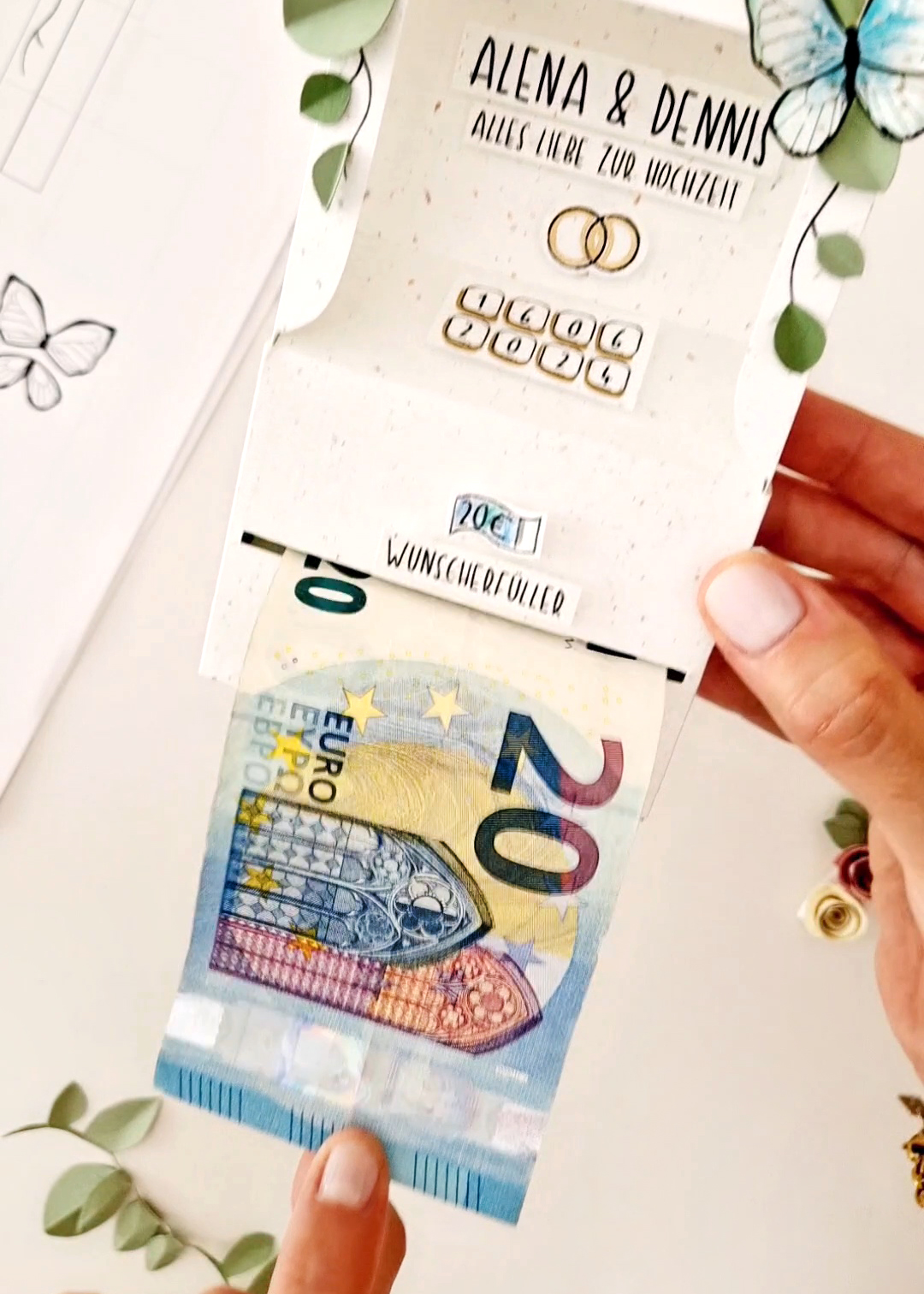 Heute zeige ich euch, wie ihr diesen super schönen Geldautomat als Geschenk zur Hochzeit oder zum (runden) Geburtstag bastelt. Alles, was ihr dafür braucht, ist Papier, Stifte und Klebstift – denn ich habe eine fertige Druckdatei zum ganz einfachen Nachbasteln in der Materialliste. Wenn das Brautpaar am ersten Geldschein zieht, dann kommen nach und nach immer mehr der aufgerollten Scheine zum Vorschein und ganz zum Schluss erscheint noch eure Glückwunschkarte ;) Ich habe ein Motiv mit Blumen und eines mit einem Schmetterling. Viel Spaß beim Basteln!