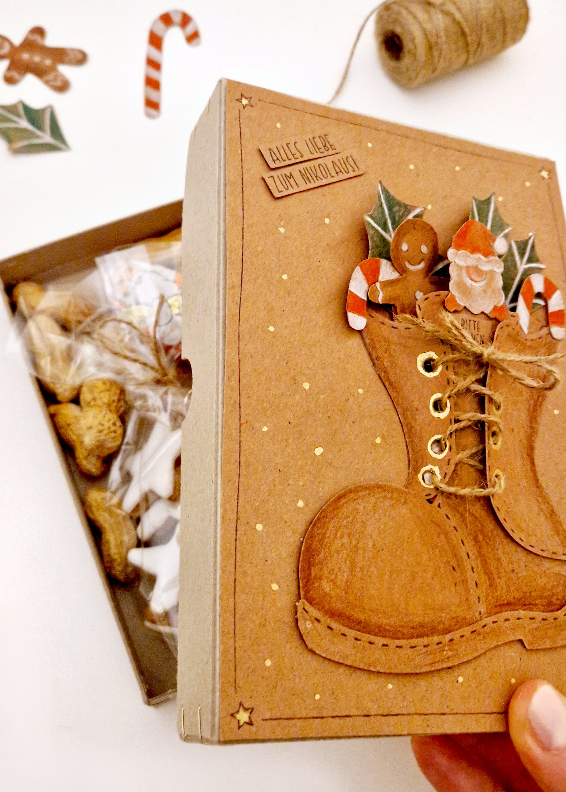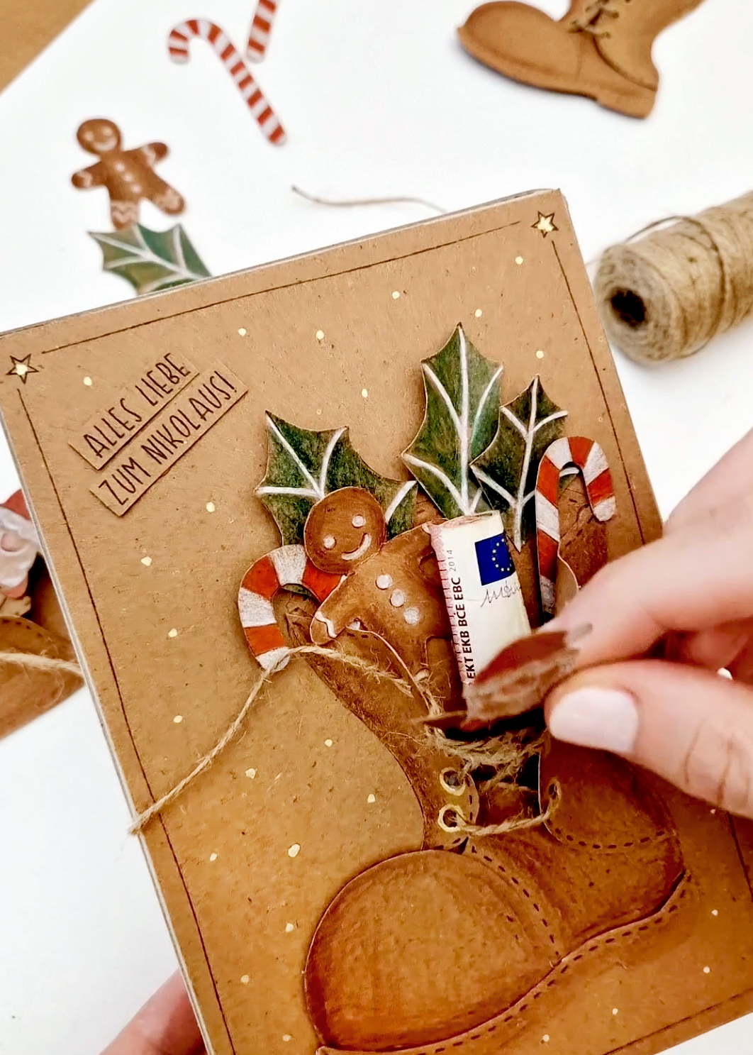 Hier zeige ich euch ein schönes DIY Geldgeschenk zum Nikolaus – nämlich diesen 3D Nikolausstiefel aus Kraftpapier, dessen Schnürsenkel sich öffnen lassen und in dem sich ein Geldschein versteckt ;) Ihr könnt diese Idee als einfache Karte verwenden oder aber auf eine passende Pappschachtel (siehe Materialliste) aufkleben, in die ihr dann noch ein paar Süßigkeiten oder andere Mini-Geschenke packen könnt. Damit dieses Geldgeschenk zum Nikolaus auch wirklich einfach nachzubasteln ist, habe ich die Druckvorlage für euch in der Materialliste verlinkt.