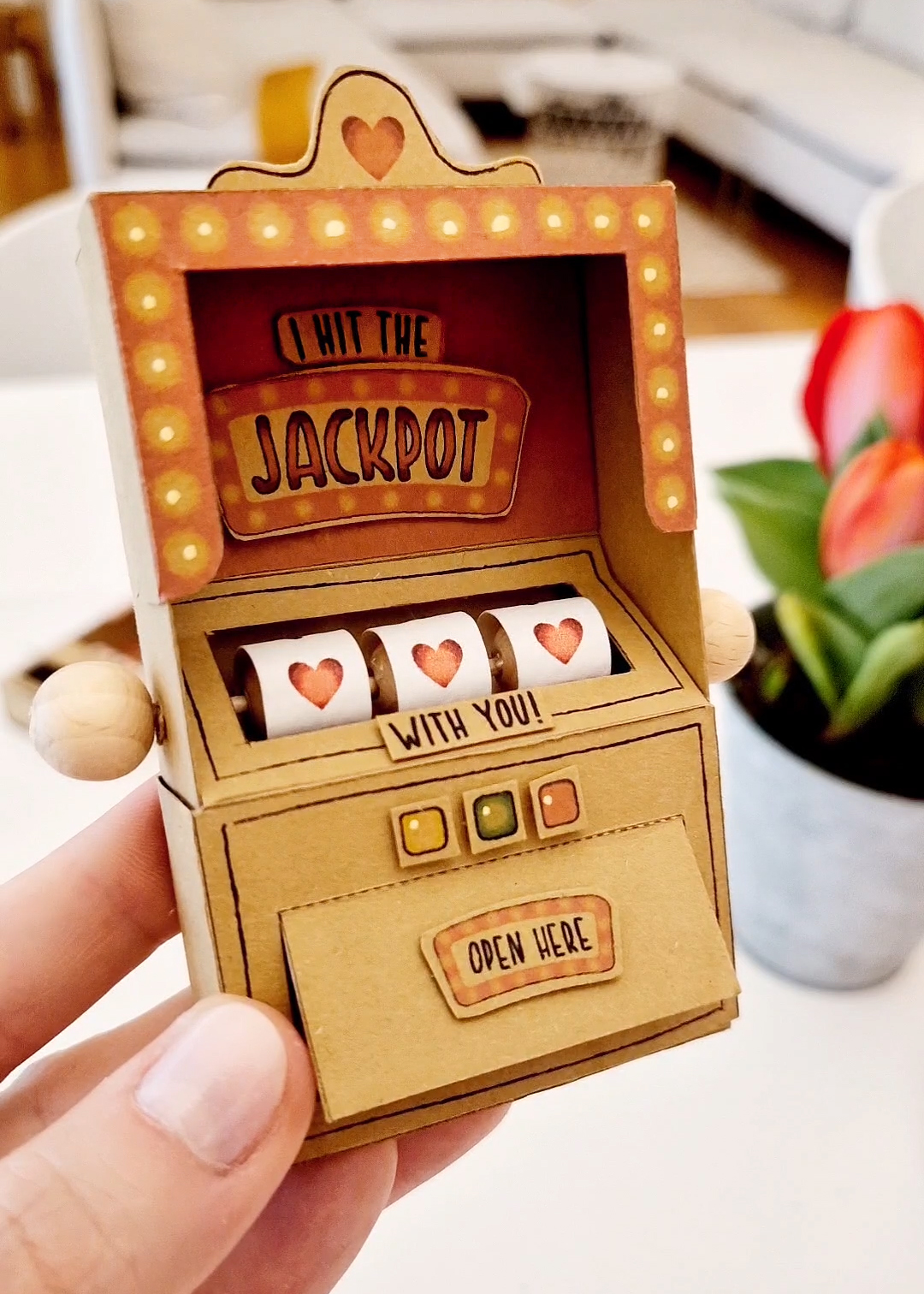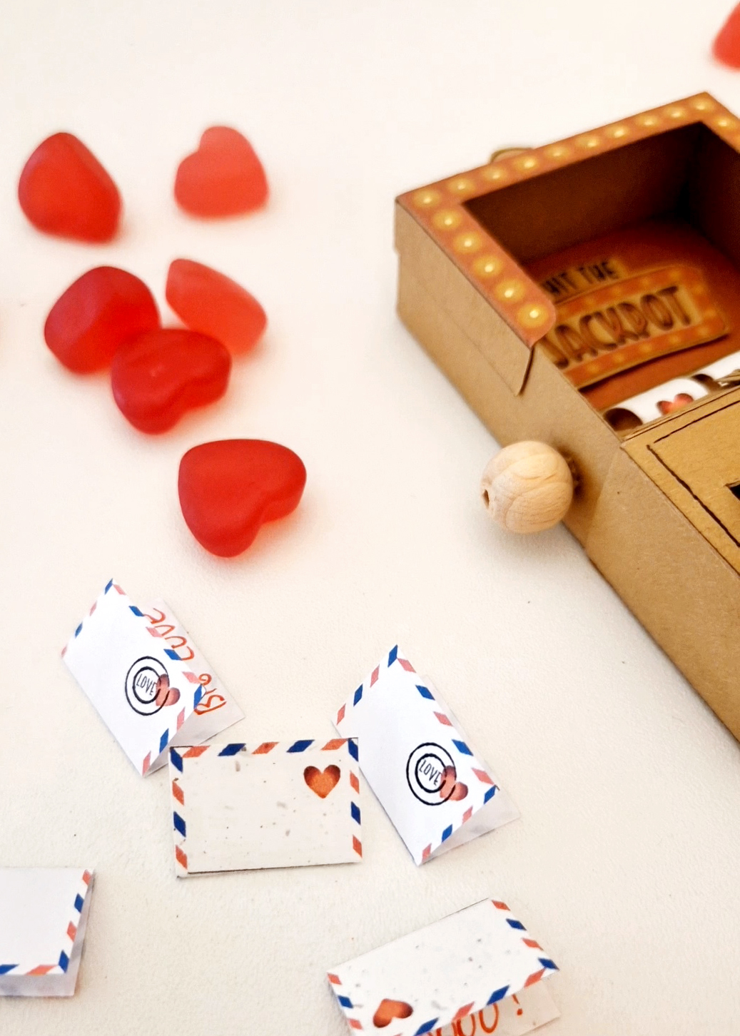 Ich habe hier eine niedliche Geschenkidee für euren Lieblingsmenschen. Ob für euren Partner, für die beste Freundin oder Mama – der kleine DIY Jackpot ist auf jeden Fall eine besonders süße Geschenkidee, die ihr auch ganz persönlich anpassen könnt. Wenn ihr am Rädchen dreht und dreimal Herz erscheint, kann der Beschenkte sogar einen kleinen Gewinn aus dem Fach holen ;) Hinein könnt ihr entweder Süßigkeiten tun, aber auch Mini-Liebesbriefe sind mit in der Druckdatei enthalten. Die Vorlage mit deutscher und englischer Version habe ich wie immer in der Materialliste verlinkt.