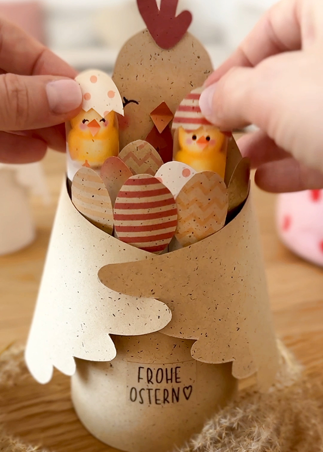Wenn ihr die Henne mit den Schokoküken als Ostergeschenk bastelt, dann freue ich mich total, wenn ihr mir eure Ergebnisfotos zeigt – ich teile sie regelmäßig in meiner Instagram Story ;)