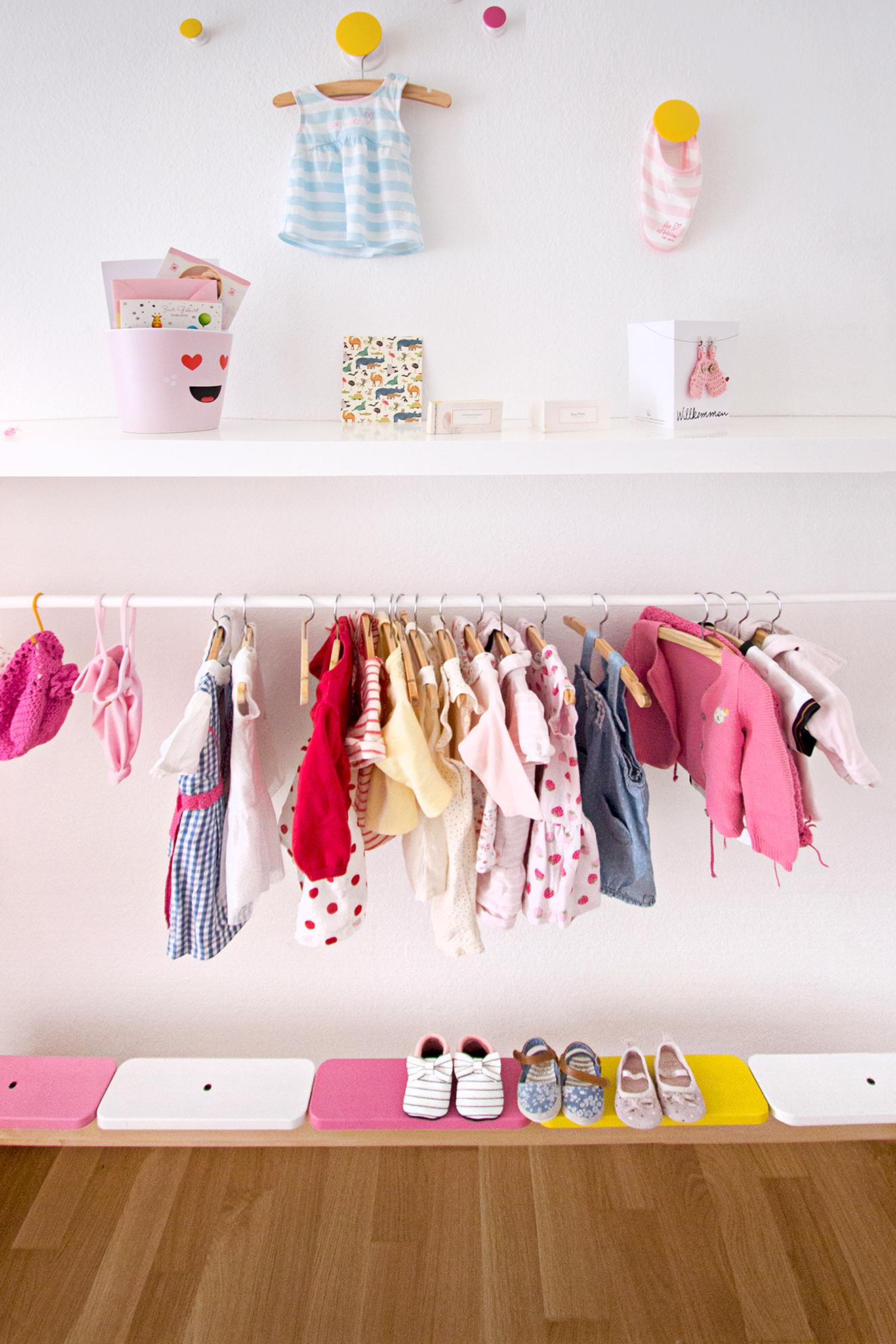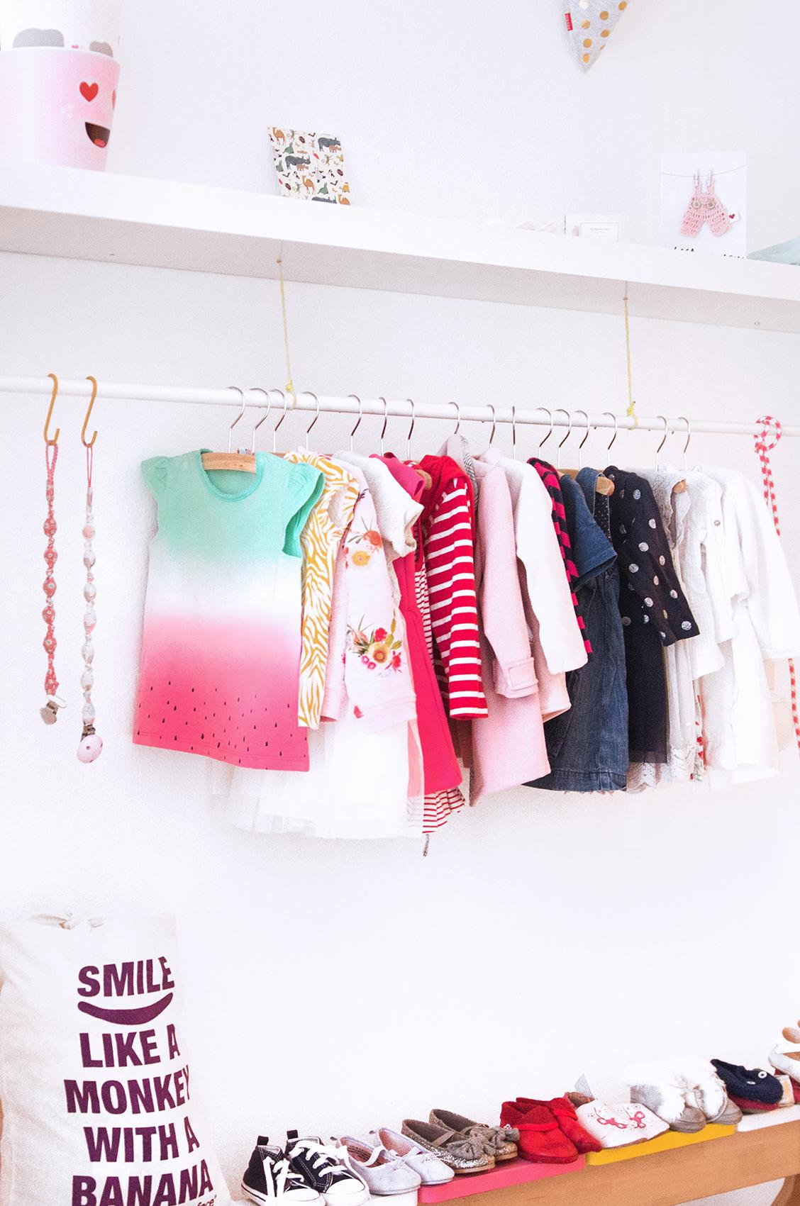 Luises Garderobe ist ganz einfach selbst gemacht: nämlich aus einer Duschstange vom Baumarkt, die ich links und rechts eingespannt habe. Nach oben hin ist sie zusätzlich mit Kordeln am Regal befestigt. Noch ein paar Kleiderbügel und Haken dran und fertig! Für Luises Schuhe habe ich unsere alte IKEA PS Balancebank mit Spray in meinen liebsten Mädchenfarben besprüht. Und hier ist unsere fertige Mini-Garderobe: