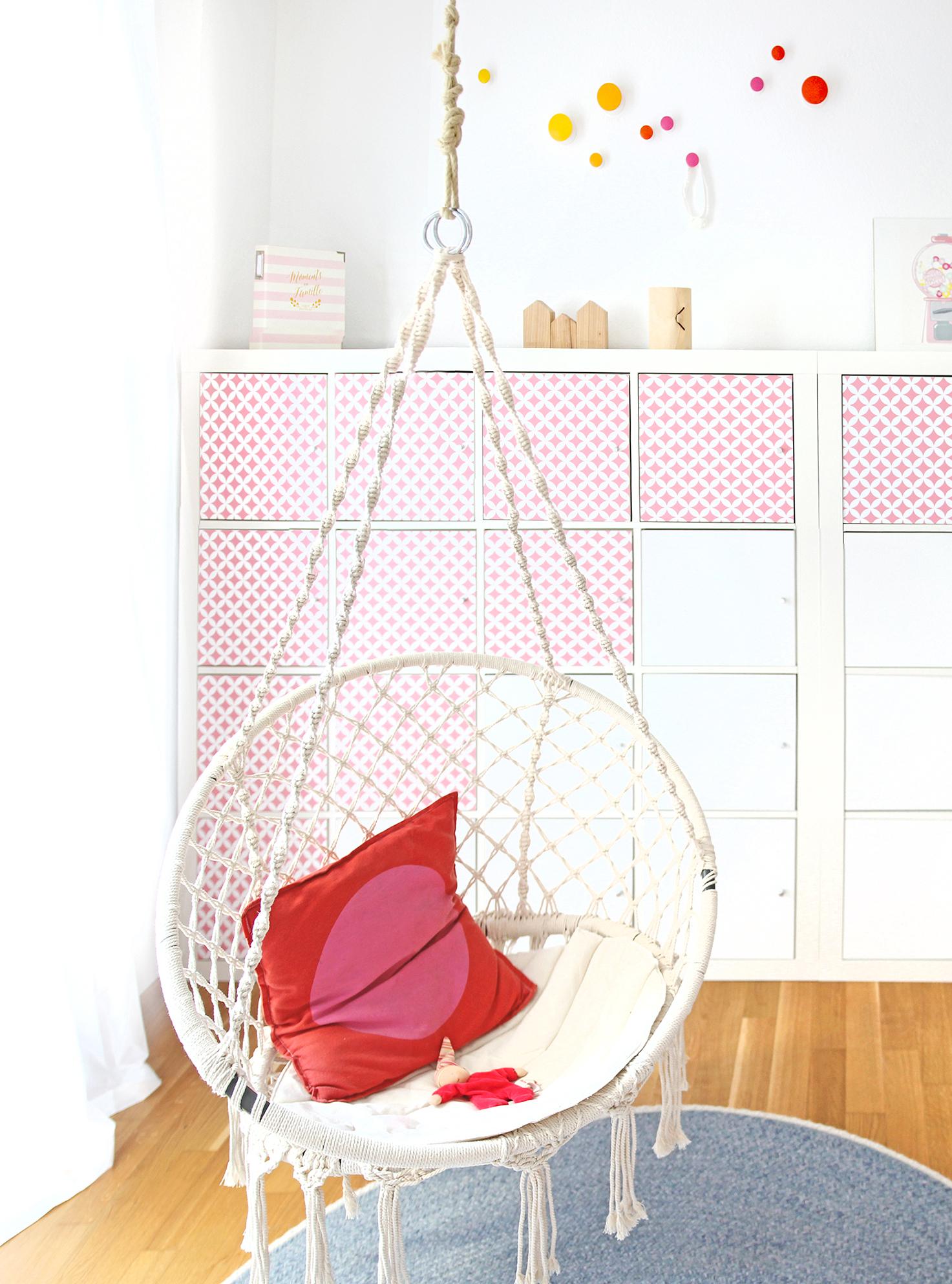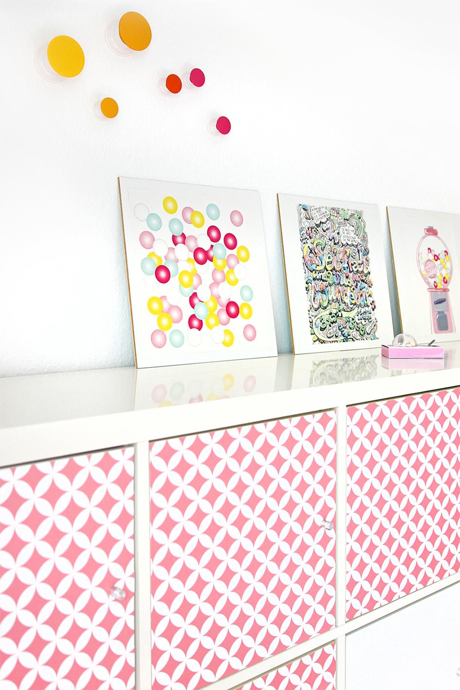 Ich habe unser altes KALLAX-Regal* fürs Kinderzimmer tauglich gemacht, indem ich mir ganz einfach selbstklebende rosa gemusterte Folie bestellt habe. Nämlich diese hier: KLICK*