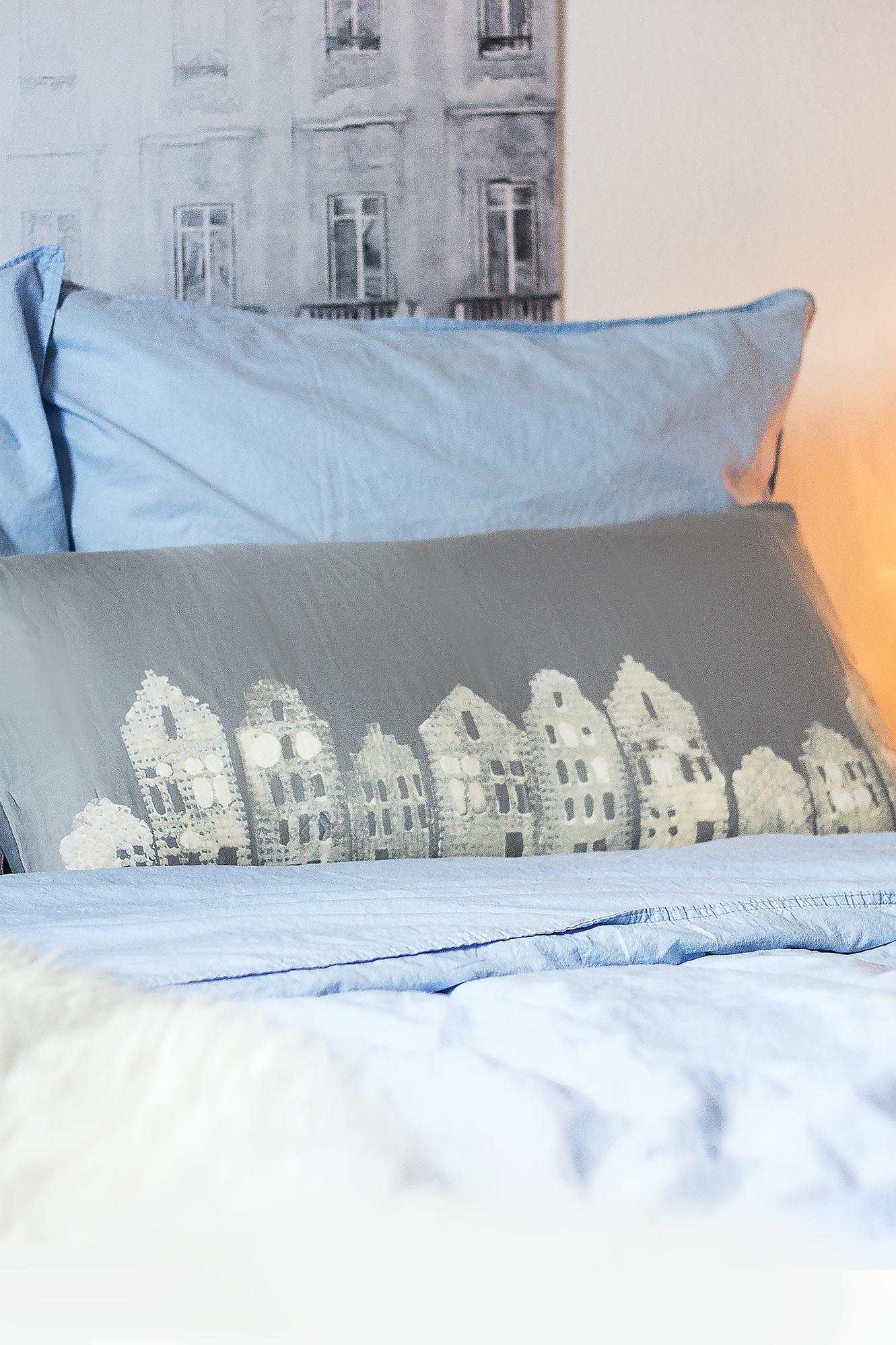 Fertig ist das winterliche DIY-Kissen mit der süßen Häuschen-Kulisse. Mir gefällt es wirklich richtig gut und ich finde, es war den Aufwand und die Geduldsprobe absolut wert ;) Das Kissen ziert jetzt unser Schlafzimmer: