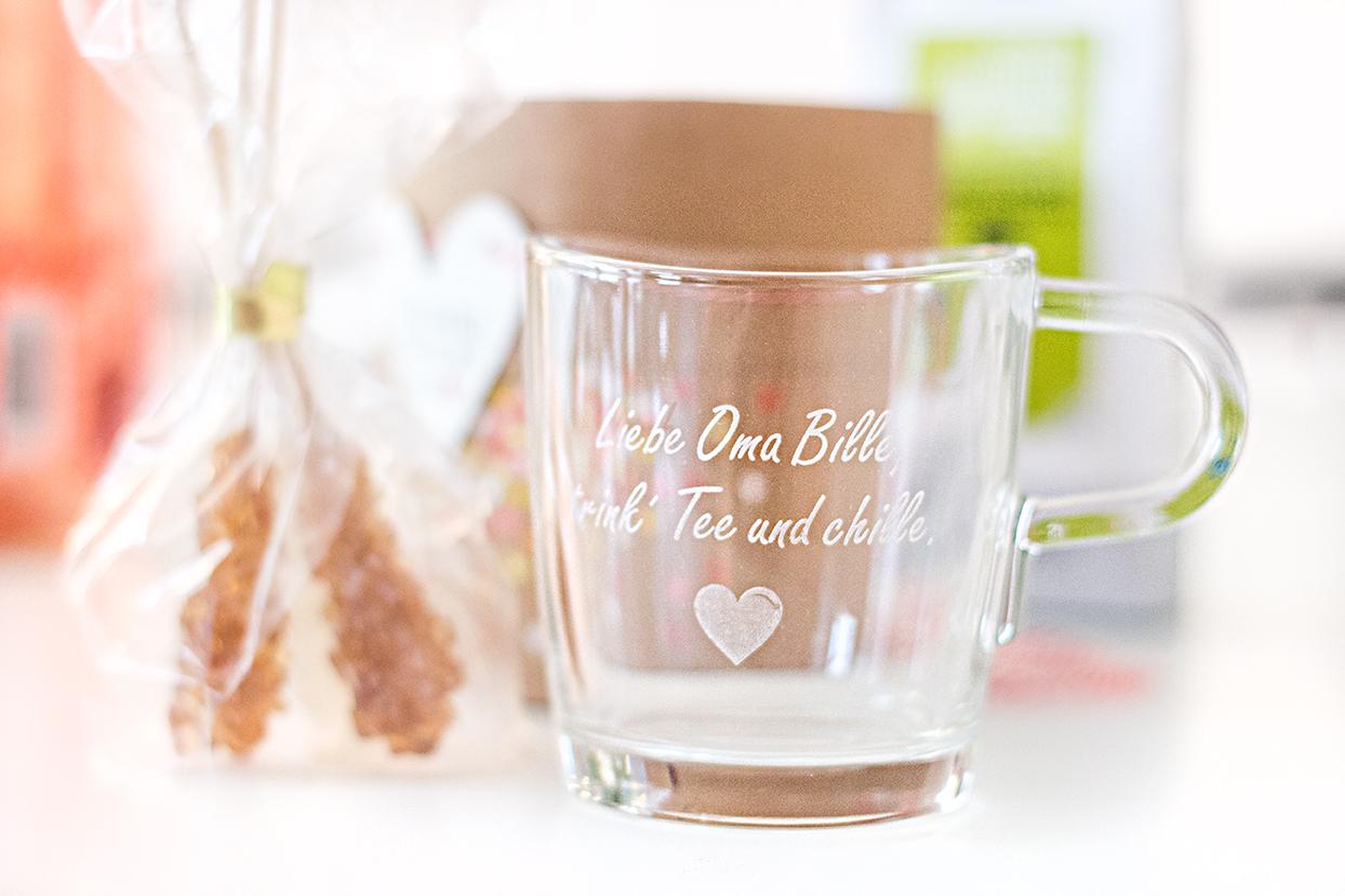 Dann mal los! Wer hat einfach immer ein Geschenkchen verdient? Weil sie immer für einen da ist, einem vieles abnimmt und ganz selbstverständlich hilft wo sie nur kann? Genau, MAMA! Für meine Mama und inzwischen Luises Oma Sybille, die eine große Teeliebhaberin ist, habe ich mir eine feine gläserne Teetasse ausgesucht (KLICK). Da meine Mama inzwischen schon vier Enkel hat und nur am herumrennen und babysitten ist, nebenher noch selbstverständlich bei meinem Vater in der Firma arbeitet und sich auch sonst um alles und jeden kümmert, fand ich diesen Reimspruch als Ansporn zum Auch-mal-ne-Pause-machen sehr passend: „Liebe Oma Bille, trink‘ Tee und chille.“