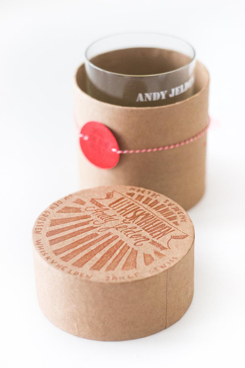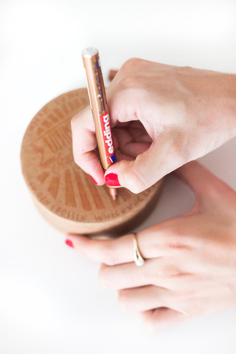Und auch dem Whiskyglas stünde doch eine schöne Verpackung aus einer Blanko-Schachtel gut, oder? Mit einem bronzefarbenen Edding kann man sie super schön und dezent verzieren: