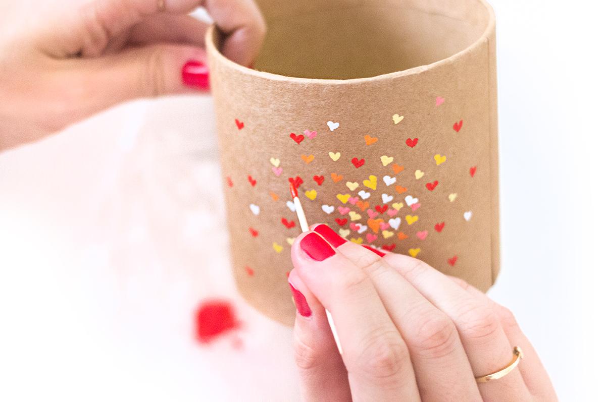 Damit das kleine persönliche Geschenk auch fein verpackt daherkommt, habe ich noch eine selbstgebastelte Verpackung und einen leckeren Tee dazu besorgt. Mit einer Blankoschachtel (z.B. von HIER), einem Zahnstocher und ein bisschen Acrylfarbe kann man ganz schnell eine farbenfrohe Teedose basteln: