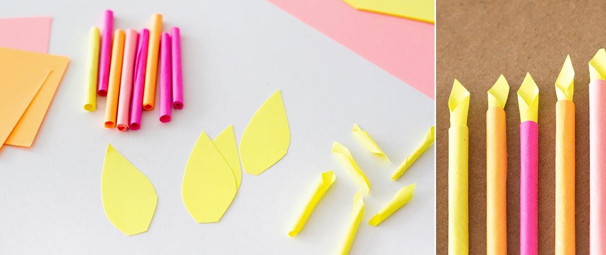 1.) Kerzen basteln Schneidet sieben ca. 6 x 6 cm große Quadrate aus dem neonfarbenen Papier aus. Nehmt den Zahnstocher zur Hand und wickelt das Papier ganz eng um diesen herum auf. Klebt das Röllchen mit dem Klebstift zu. Bastelt alle sieben Röllchen. Schneidet dann gelbe flammenförmige Stücke aus dem gelben Papier aus – deren Höhe sollte ca 4 cm sein. Rollt nun diese Flammen auf dieselbe Art mit dem Zahnstocher auf (siehe Abbildung). Steckt die Flammen in die Rollen hinein – fertig sind die Kerzen.