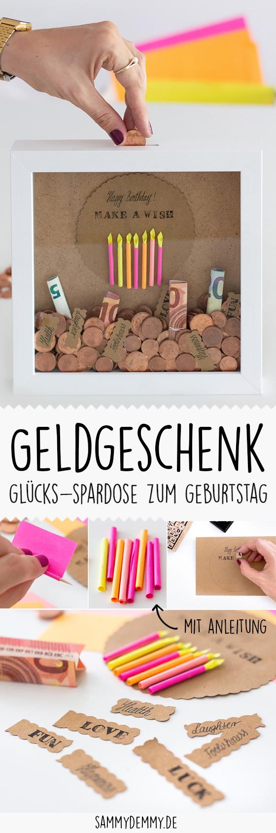 Eine richtig coole Idee für die Gestaltung eines kreativen Geldgeschenks ist diese Bilderrahmen-Spardose. Darin könnt ihr eurem Freund zum Geburtstag schon mal ein Startguthaben für einen besonderen Wunsch hinterlassen und er selbst kann dann bei Bedarf weiter sparen ;) Auch die wichtigsten aller Glückwünsche, die mit Geld nicht zu bezahlen sind, könnt ihr ganz individuell als kleine Glücksbotschaften inmitten der Glückscents hinterlassen. Fehlt nur noch eine kleine Geburstagstorte mit Kerzen, die der Beschenkte zumindest in seiner Fantasie auspusten kann. Dann mal Augen zu und: Make a wish!