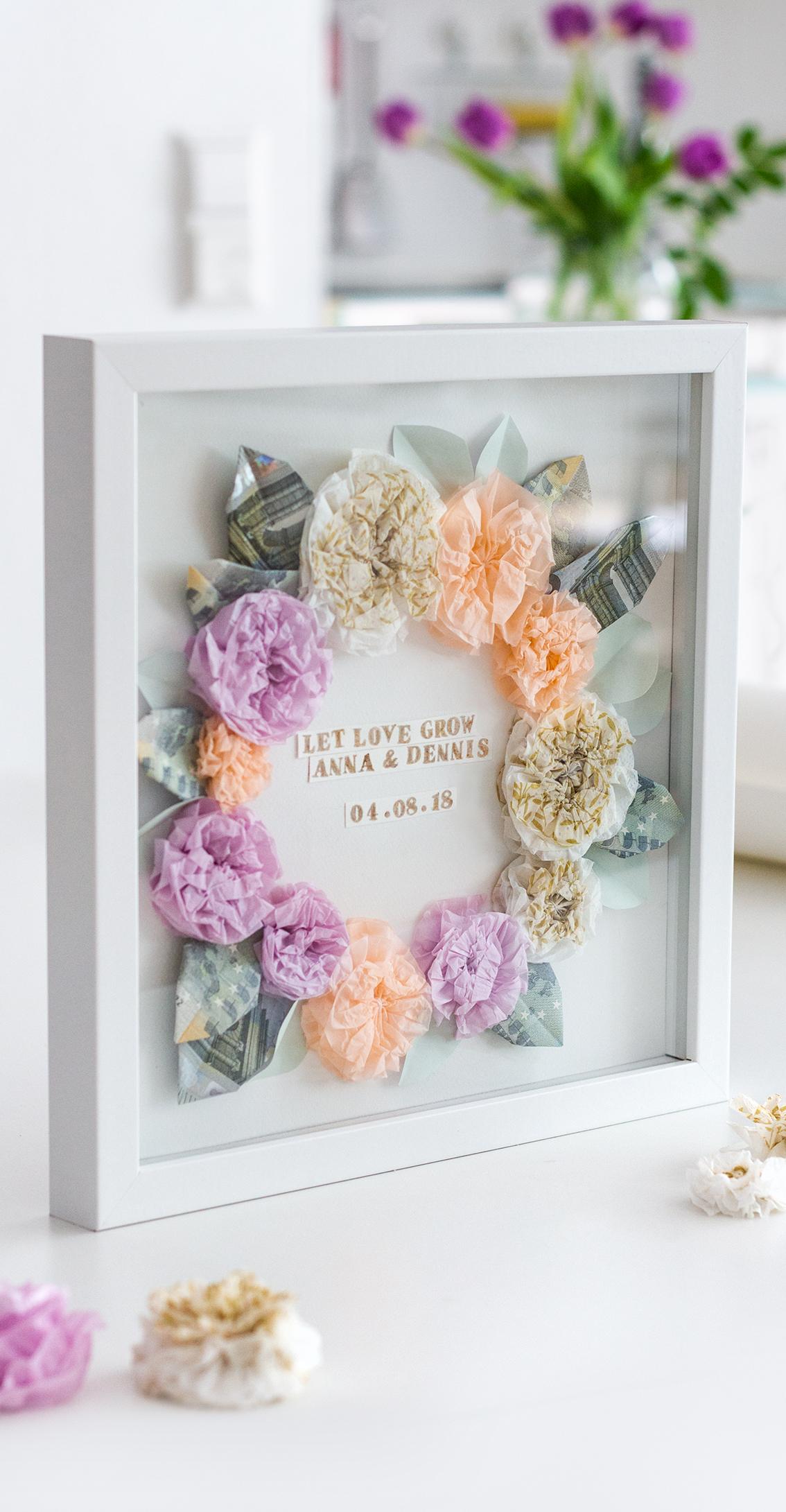 Der selbstgebastelte Blumenkranz mit persönlicher Widmung erfreut das Brautpaar garantiert. In dem schlicht weißen 30×30 großen Objektrahmen wirken die pastellfarbenen Blumen und Geldschein-Blätter wunderschön zart und leicht. Dieses Geschenk wird eure verheirateten Freunde noch lange an ihren besonderen Tag erinnern – denn auch nachdem die Geldscheine herausgenommen worden sind, sieht der Blumenkranz noch wunderschön aus und findet bestimmt ein schönes Plätzchen an der Wand.