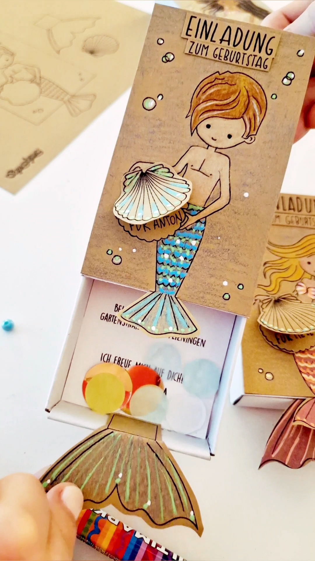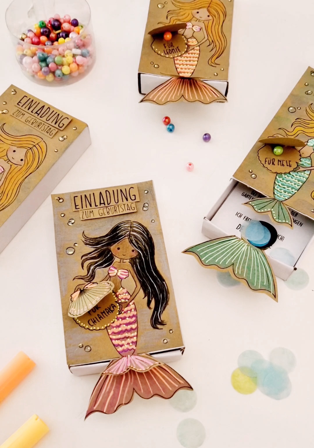 Heute zeige ich euch hier, wie ihr diese süße Meerjungfrau Einladung aus Streichholzschachteln bastelt ;) Falls eure Kinder also dieses Motto für ihre Party ausgesucht haben, passen die perfekt! In der aufklappbaren Muschel auf der Vorderseite versteckt sich sogar noch ein Perle und der Name des kleinen Gasts. Viel Spaß beim Basteln! Nachtrag: Auf euren Wunsch hin habe ich die Datei um einen Meerjungen ergänzt.