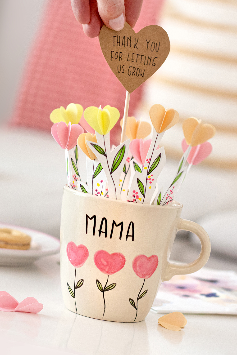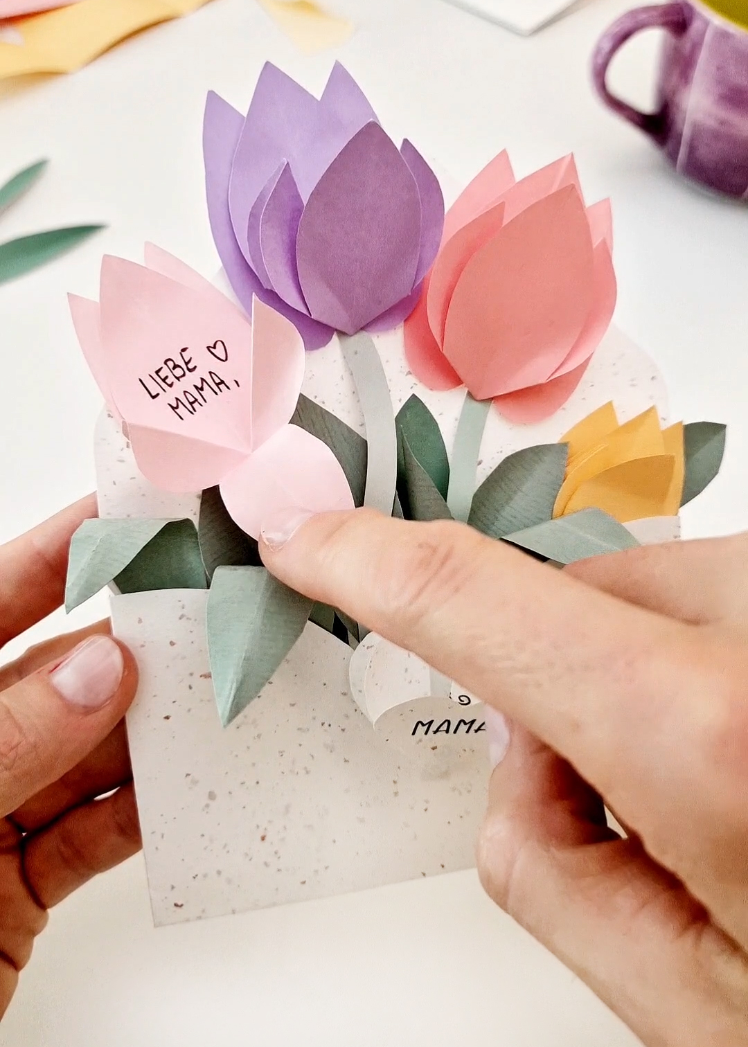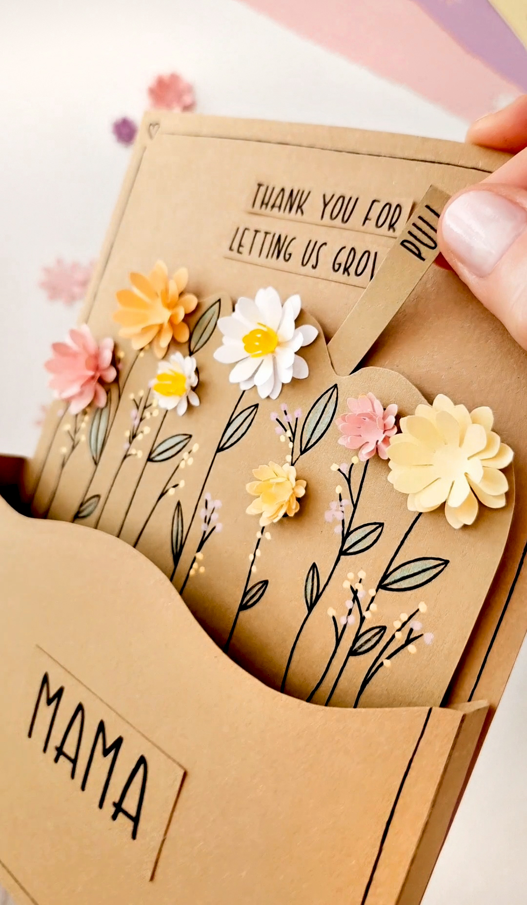 So zeigt ihr eurer Mama auf anschauliche Weise, wie dankbar ihr seid, dass sie euch liebevoll großgezogen hat. Beim Hochziehen der Karte wachsen die Blumen farbenfroh in die Höhe.