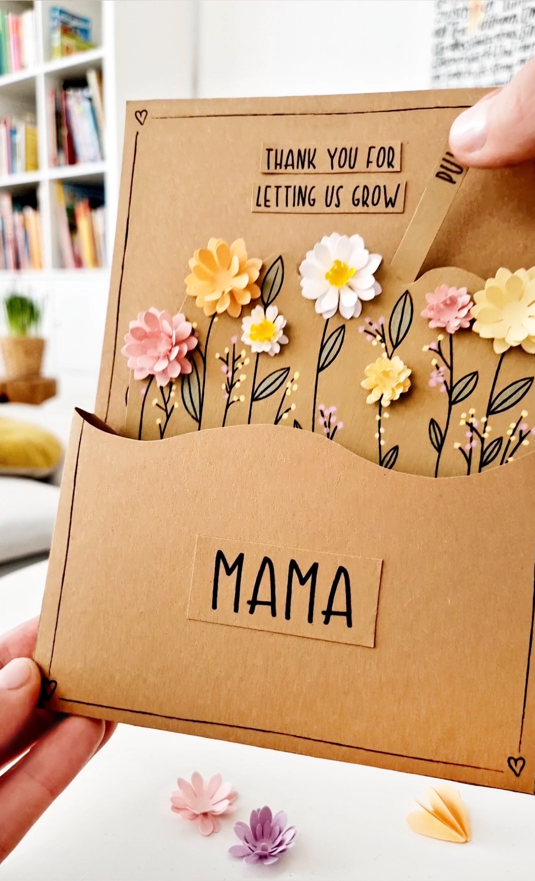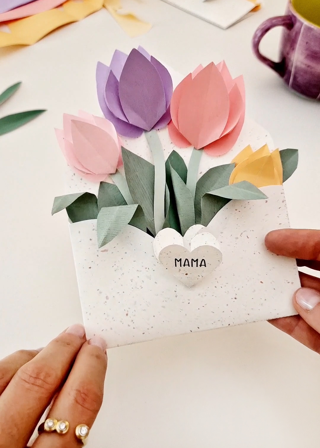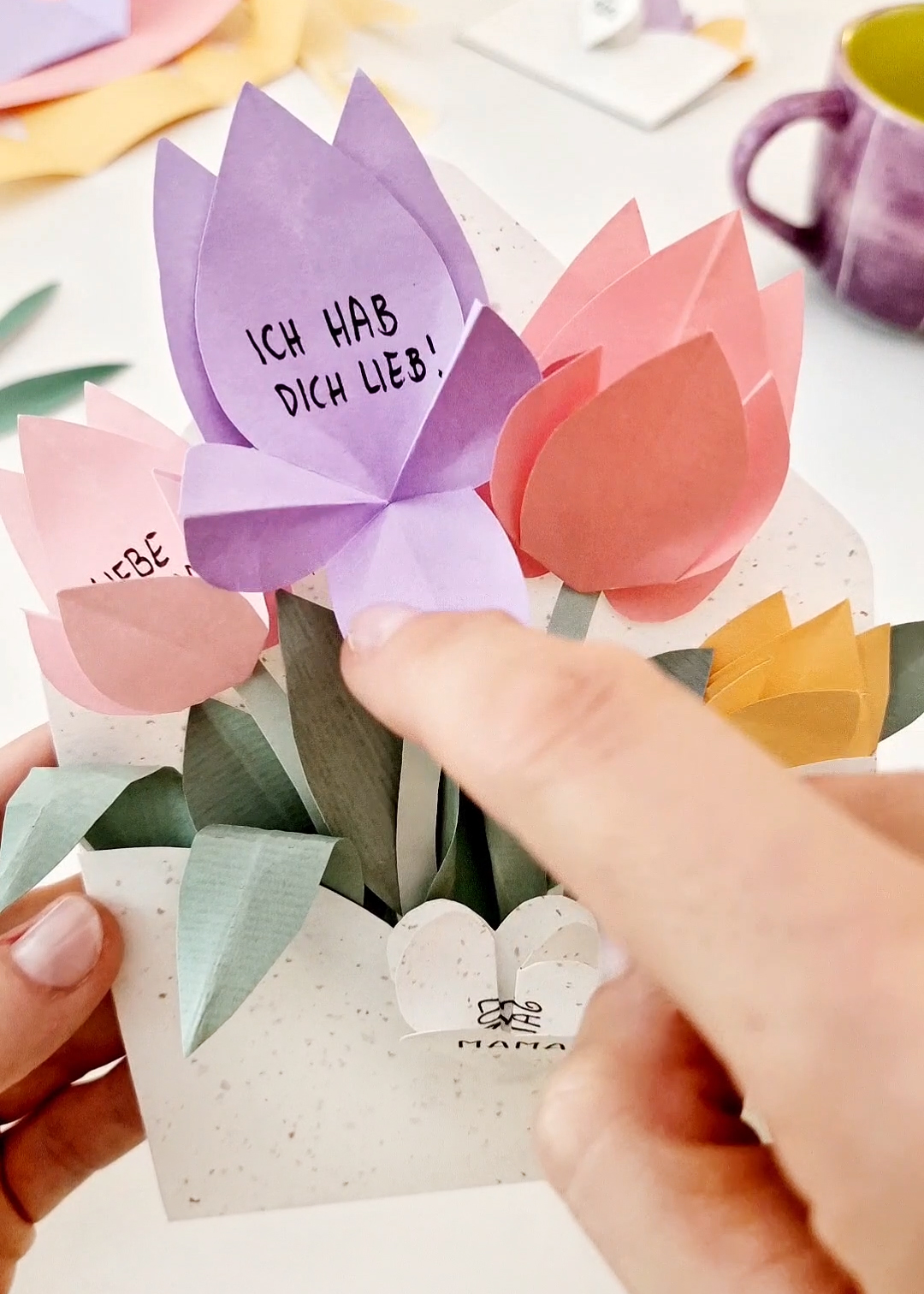 Diese süßen Papierblumen im Briefumschlag lassen sich aufklappen und hervor kommen kleine selbstgeschriebene Nachrichten an Mama ;)