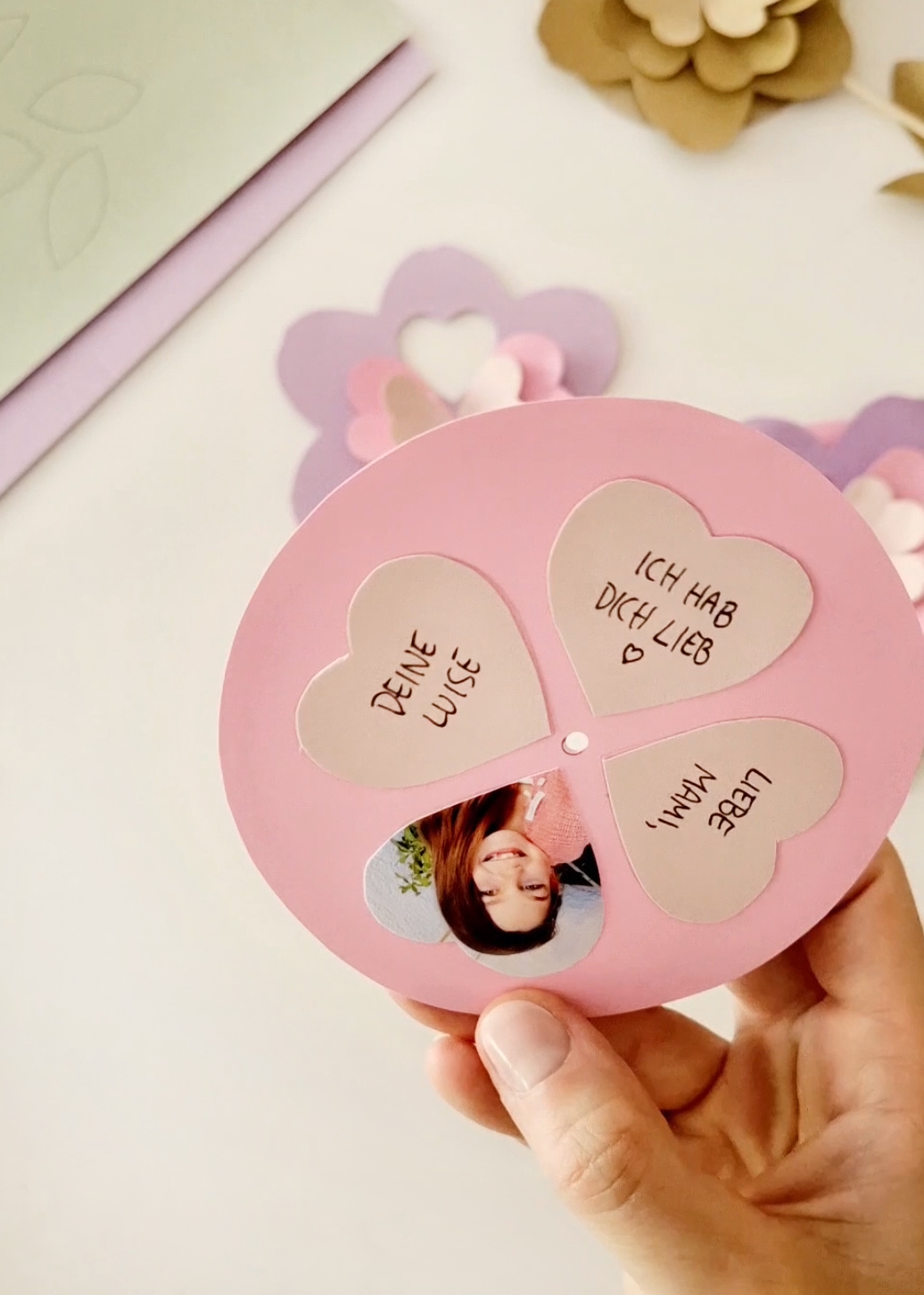 Hier habe ich eine hübsche Papierblume mit integrierter Drehscheibe: Beim Drehen an den Blättern tauchen im Herzrahmen nach und nach süße Nachrichten oder Fotos auf.