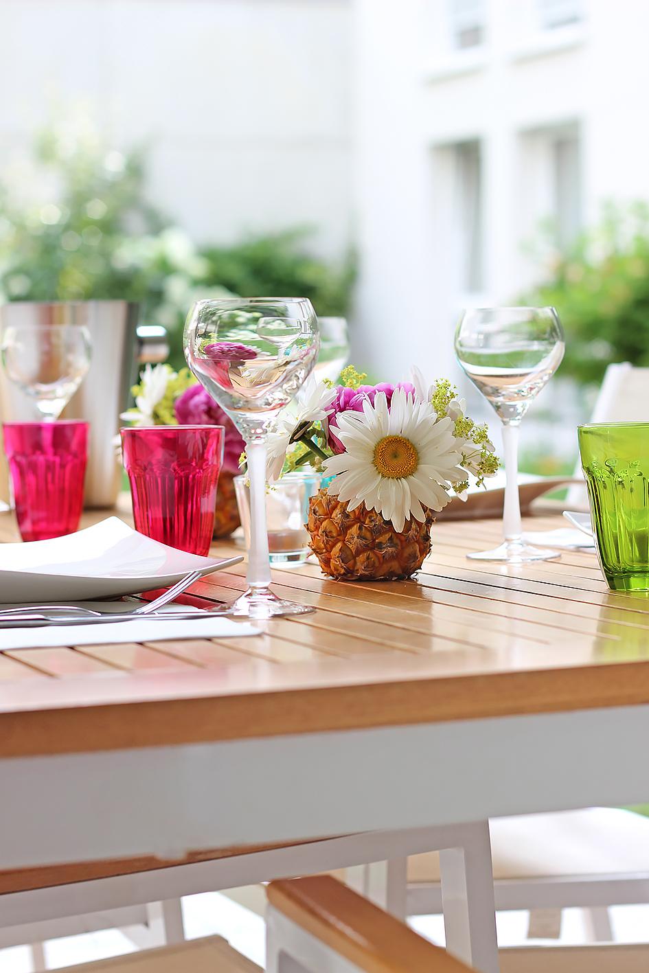 Noch eine Tischdeko-Idee, die ich auf Instagram entdeckt habe und sofort nachmachen musste: Blümchen in Ananas ;) In meinem Fall sind es Mini-Ananasse, der Rewe hatte mal wieder die Hälfte meiner Wünsche nicht auf Lager. Aber auch die machen sich gut auf dem gedeckten Tisch: