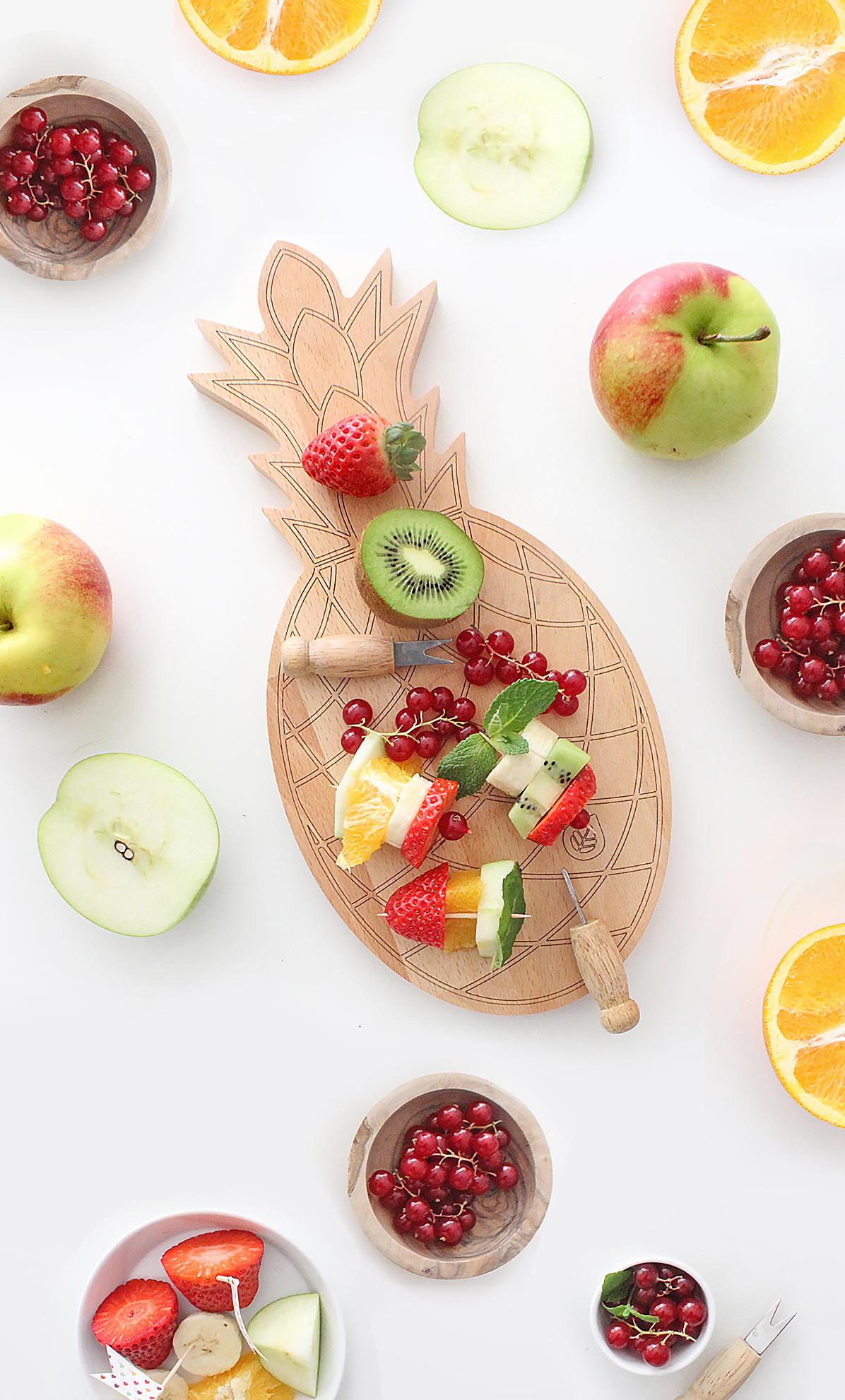Apropos Ananas: Schon länger eins meiner Lieblingsstücke ist dieses handgefertigte Ananas-Brett, von dem Fruchtspieße mindestens doppelt so gut schmecken. Ihr bekommt dieses Brettchen und auch andere Fruchtformen hier: KLICK